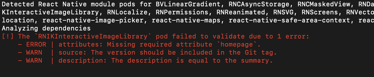 [!] The `RNIKInteractiveImageLibrary` pod failed to validate due to 1 error: