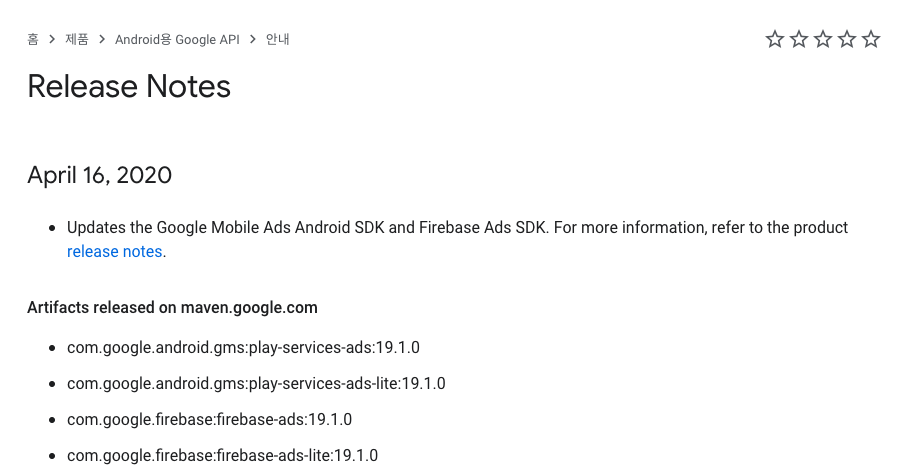 April 16, 2020 Updates the Google Mobile Ads Android SDK and Firebase Ads SDK. For more information, refer to the product release notes. Artifacts released on maven.google.com com.google.android.gms:play-services-ads:19.1.0 com.google.android.gms:play-serv