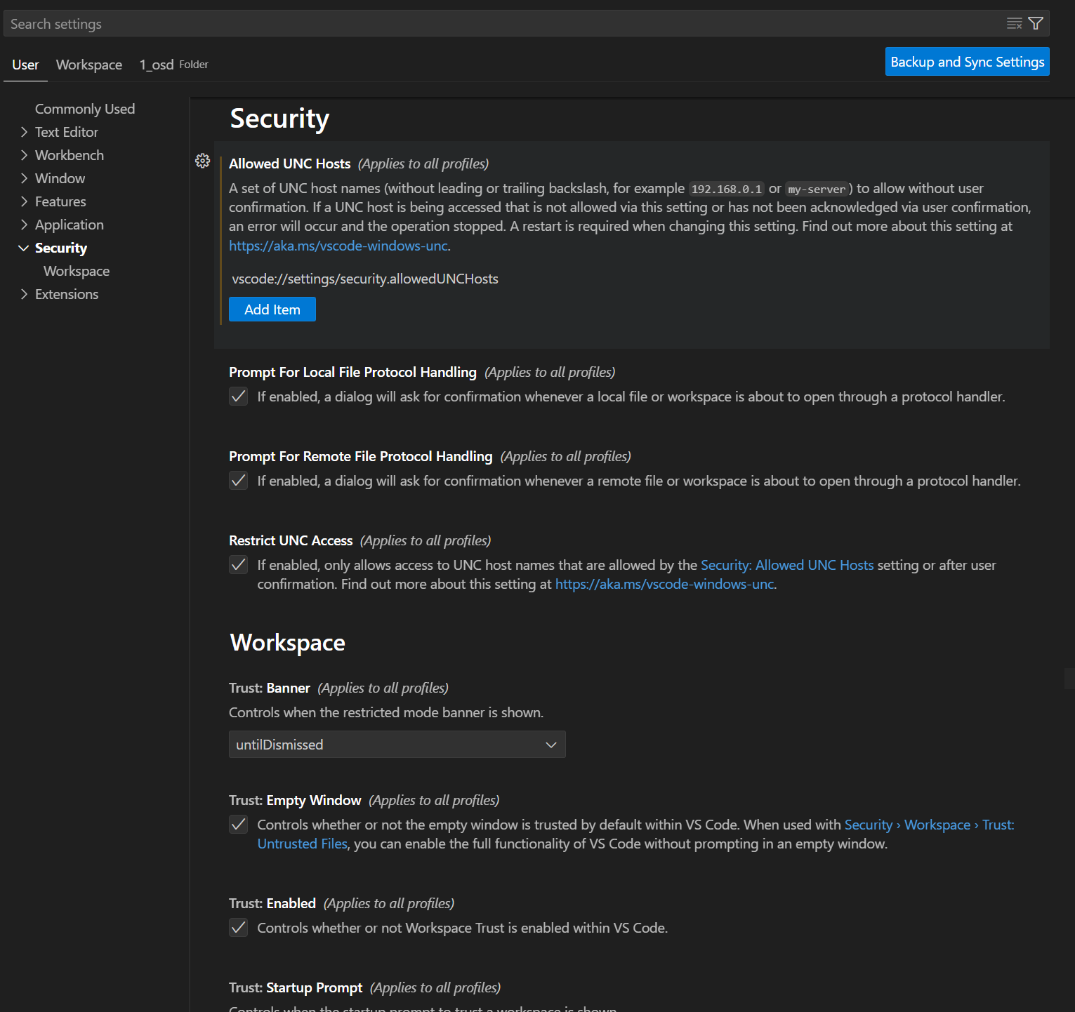 ctrl+ , 눌러서 setting 메뉴 켠후 security 들어가서