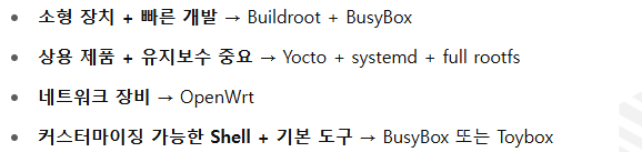 - 자체적인 빌드 시스템 존재 (Buildroot와 유사하지만 다름)